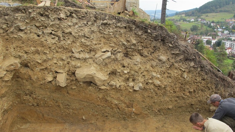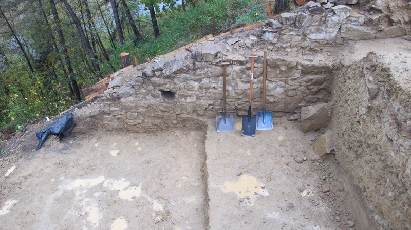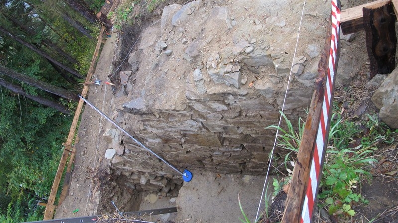 We wschodniej części założono wykop X, gdzie odsłonięto wychodnie skał, na których wzniesiono zamek. W pobliżu muru obwodowego odsłonięto skośnie przebiegające warstwy prawdopodobnie z okresu poprzedzającego budowę muru obwodowego. Odsłonięto też poziom użytkowania zamku wyróżniający się ciemniejszą smugą ziemi.