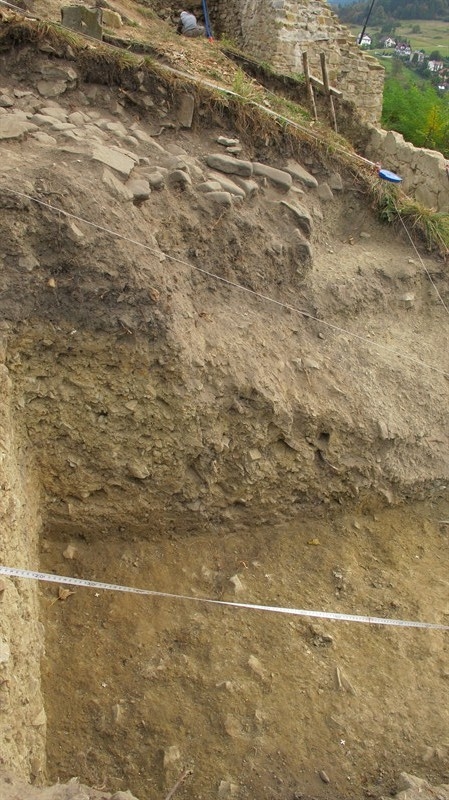 W centralnej części terenu objętego badaniami zlokalizowano wykop IX, w którym odsłonięto dalsze nawarstwienia z dwóch poziomów użytkowych: starszego poziomu użytkowego zamku, zaznaczającego się ciemniejszą smugą w nawarstwieniach ziemnych, natomiast na części obszaru tuż pod powierzchnią odsłonięto dobrze zachowany bruk kamienny, stanowiący młodszy poziom użytkowy z okresu nowożytnego. W tej części wykopów odsłonięto też partie muru obwodowego, którego sposób murowania wskazuje na zmiany w tkance murowanej. Zmiany te związane są prawdopodobnie z destrukcją lub przebudową części murów obronnych. Nawarstwienia ziemne w sąsiedztwie opisywanego muru wskazują na ślady pożaru, z którym być może związana jest destrukcja i późniejsza naprawa muru.